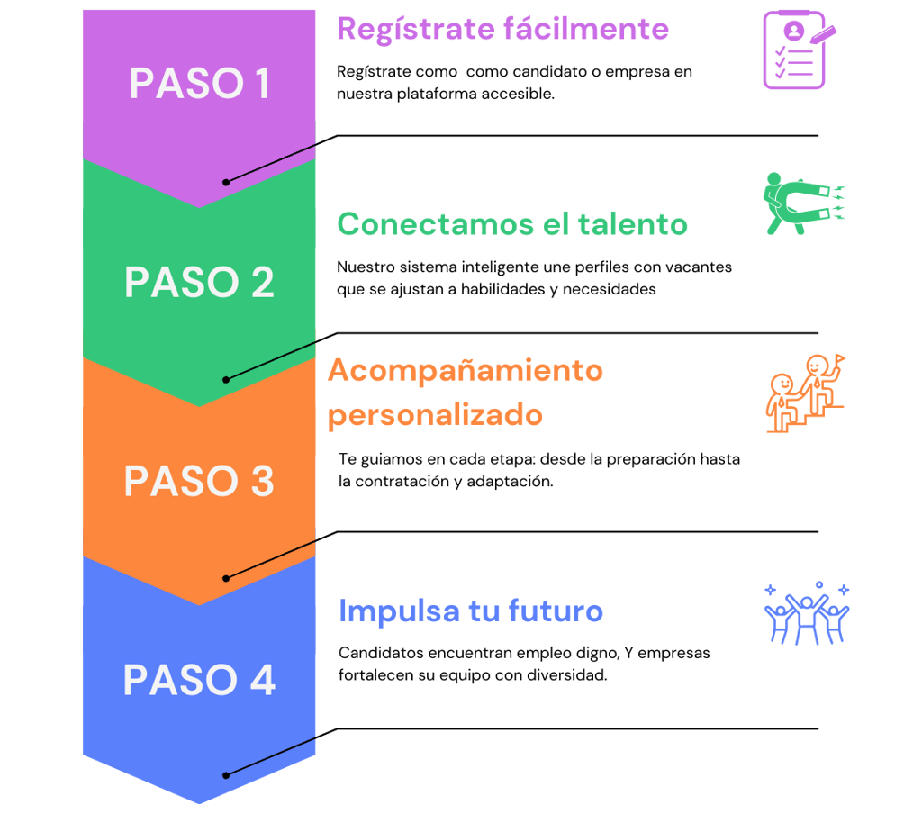 Conectar talento con discapacidad con empresas comprometidas, facilitando empleos dignos, accesibles y formales, en cumplimiento con la normativa mexicana, para impulsar la inclusión laboral y el desarrollo económico sostenible.